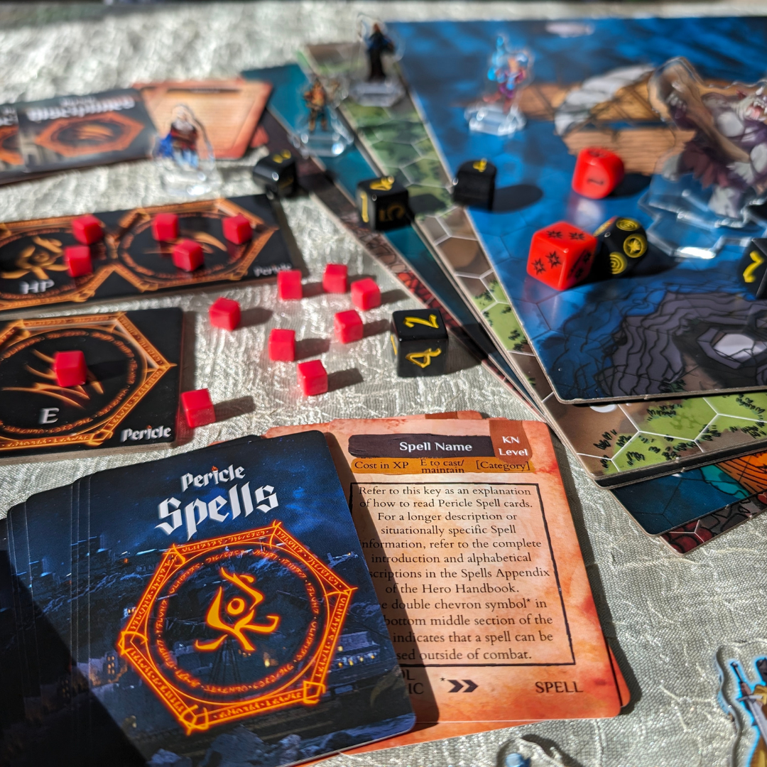 Pericle: Gathering Darkness is a hefty game, weighing in at around 12 pounds. Each component was hand picked and thoughtfully crafted, from the original full-color maps to the double-sided acrylic character standees. Loremaster weaves the tale and displays painterly images to set the scene. Pericle's proprietary dice system shines as battles are won and lost over 60+ hours of campaign-style gameplay. Beautiful artwork, unique tactical mechanics, and sturdy components bring the world of Pericle to life on the tabletop.