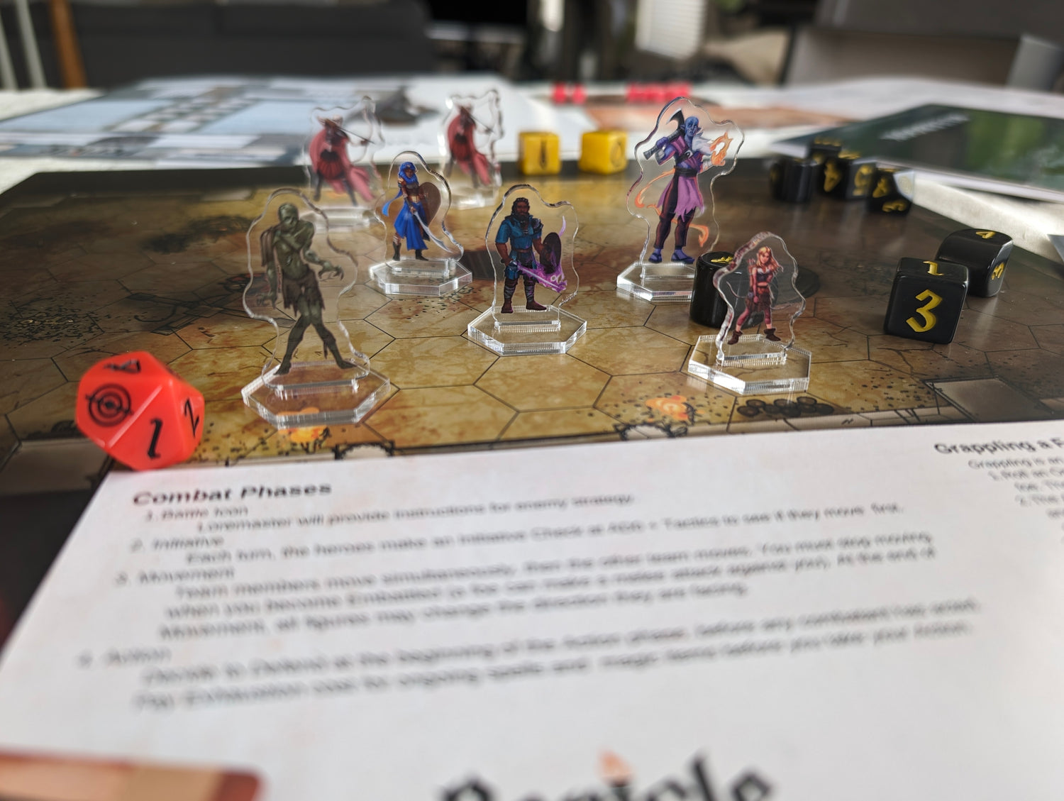 Let’s consider what it looks like to play Pericle. Typically a table setup will have space for the map in the middle, a laptop with Loremaster on the table in a spot where all players can view it, and dice in the middle near the map. Players’ hero standees are in the middle as well. In front of each player, we’ll have the hero sheet with all of your hero’s information, the combat cheat sheet as a reminder of what actions are available during combat, and maybe the optional health trackers or spell & discipline cards.